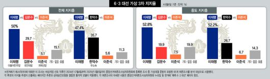 한 후보의 ‘비교우위’는 보수층 지지도는 물론 ‘중도 확장력’에서도 김 후보를 앞서는 데 힘입은 것으로 보인다. 일단 3자 구도의 보수층 지지율에서 한 후보는 64.2%로 김 후보(54.5%)보다 경쟁력이 앞선다. 중도층 경쟁력도 마찬가지다. 한 후보가 26.7%로부터 지지를 받는 반면, 김 후보는 19.9%에 머무른다. 부동층 흡수율도 한 후보가 우위다. 한 후보가 들어간 3자 구도에서 11.3%였던 부동층 비율은 김 후보가 들어간 3자 구도에선 15.1%까지 올라간다.
