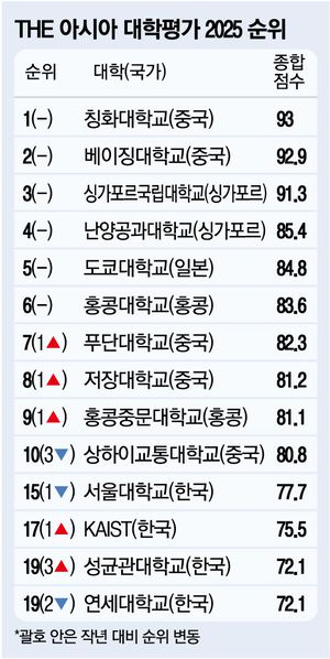 6일 발표된 ‘THE 아시아 대학평가 2025’에 따르면 지난해 국내 대학들 중 최상위를 차지했던 서울대와 2위였던 연세대 모두 작년보다 순위가 하락했다. 재작년 11위였던 서울대는 작년 14위, 올해는 15위로 나타나면서 3년 연속 내려갔다. 2023년 13위, 2024년 17위를 기록했던 연세대도 올해 19위로 떨어지는 모습을 보였다.