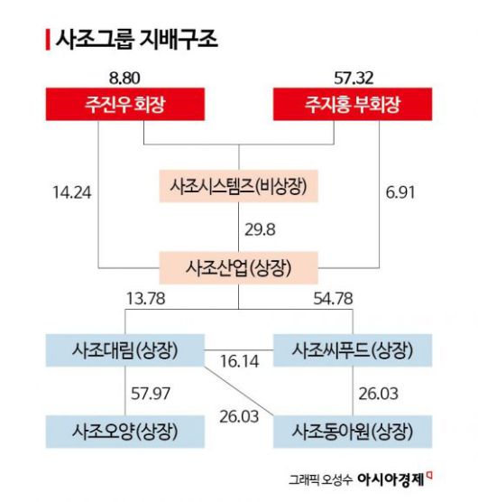 외형 성장과 함께 지배구조는 '3세 체제'로 전환되고 있다. 주진우 회장의 장남 주지홍 부회장은 그룹 실질 지주사인 사조시스템즈 지분 57.3%를 보유한 최대 주주다. 비상장사인 사조시스템즈가 상장사인 사조산업 지분 29.8%를 보유하고 있다. 사조산업은 사조씨푸드, 사조대림, 사조오양 등 주요 계열사의 모회사 역할을 수행한다. 이 구조는 '오너일가 →비상장 지주회사 →중간 지주 →사업회사'로 이어지는 전형적인 피라미드형 수직 지배구조다.
