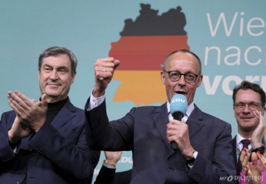 [베를린=AP/뉴시스] 프리드리히 메르츠 독일 기독민주당(CDU) 대표가 23일(현지 시간) 독일 연방의회 총선이 끝난 후 베를린 당사에서 지지자들을 향해 발언하고 있다. 이날 출구 조사 결과 중도보수 기독민주당(CDU)·기독사회당(CSU) 연합이 제1당을 차지할 것으로 예측됐다. 2025.02.24. /사진=민경찬 |