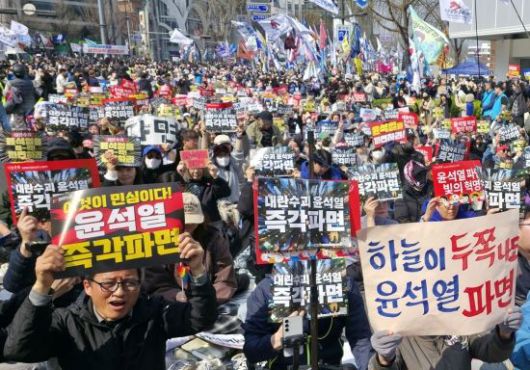 윤석열 대통령 탄핵 선고일이었던 지난달 4일 헌법재판소 부근 서울 안국동에서 탄핵을 찬성하는 시민과 단체 회원들이 찬성 촉구 집회에서 구호를 외치고 있다. 조용준 기자 |