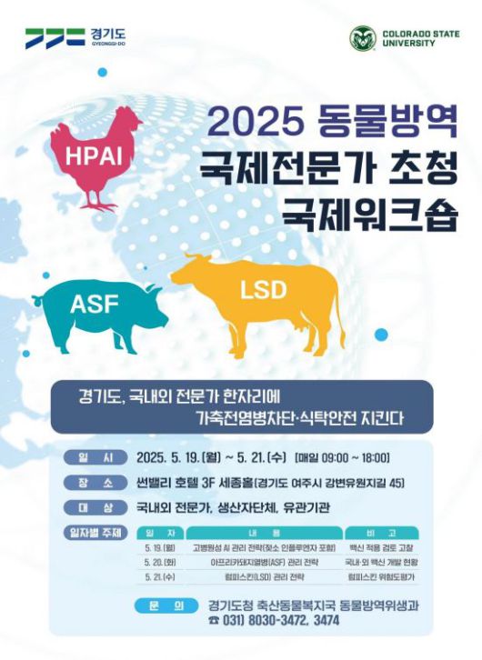 경기도는 고병원성 조류인플루엔자(AI), 아프리카돼지열병(ASF), 럼피스킨(LSD) 등 주요 가축 전염병에 대한 최신 방역 기술을 공유하는 자리가 될 것으로 기대하고 있다.