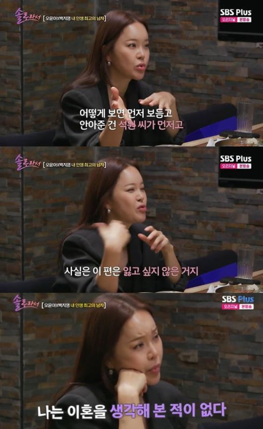 또 백지영은 "어디를 가도 '나는 이혼 생각을 해 본적이 없다'고 자주 이야기했다. 이 사람과의 이혼은 내 사전에 없다는 마음으로 살고 있다. 이 사람은 나 없으면 안 된다"며 애정을 보였다.