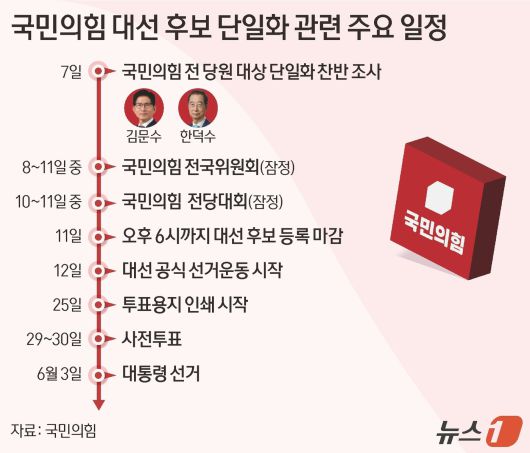 (서울=뉴스1) 양혜림 디자이너 = 국민의힘은 7일 전 당원을 대상으로 △단일화 찬반 여부 △중앙선거관리위원회 후보 등록(5월 10~11일) 전 단일화를 해야 하는지 여부를 묻기로 결정했다.hrhohs@news1.krCopyright ⓒ 뉴스1. All rights reserved. 무단 전재 및 재배포, AI학습 이용 금지.