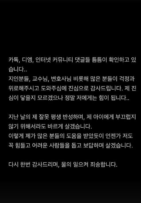 이어 "카톡, 디엠, 인터넷 커뮤니티 댓글들 틈틈이 확인하고 있습니다..지인분들, 교수님, 변호사님 비롯해 많은 분들이 걱정과 위로해주시고 도와주심에 진심으로 감사드립니다"라며"제 진심이 닿을지 모르겠으나 정말 저에게는 힘이 됩니다.."라는 글을 더했다.