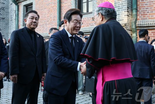 이재명 더불어민주당 대선 경선 후보가 23일 서울 명동대성당 지하성당에 마련된 프란치스코 교황 분향소에 조문하기 앞서 구요비 천주교 서울대교 총대리와 만나 대화를 나누고 있다. 2025.4.23/뉴스1 ⓒ News1 김도우 기자 |