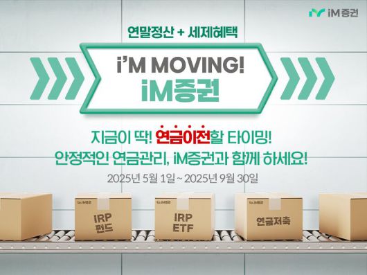 iM증권은 ‘연금 자산 이전 이벤트’를 진행한다고 7일 밝혔다. 오는 9월 30일까지 개인형 퇴직연금(IRP)과 연금저축 등 연금 자산을 다른 금융기관에서 iM증권으로 이전하는 고객에게 금액별 선착순으로 사은품을 제공한다.