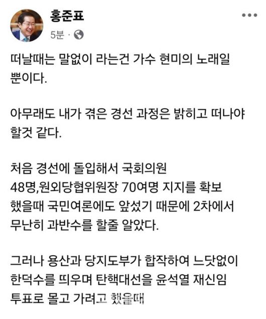 홍 전 후보는 이날 자신의 페이스북에서 “떠날때는 말없이 라는건 가수 현미의 노래일 뿐”리며 “아무래도 내가 겪은 경선 과정은 밝히고 떠나야 할것 같다”며 이같이 말했다.