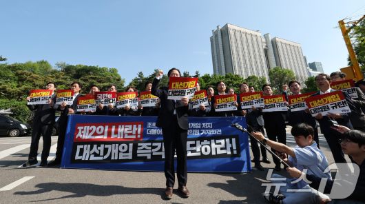 (서울=뉴스1) 장수영 기자 = 더불어민주당 정무위·기재위 소속 의원들이 7일 오전 서울 서초구 서울고등법원 앞에서 '조희대 대법원 대선개입 저지 기자회견'을 열고 이재명 민주당 대통령 후보에 대한 파기환송심 결정을 규탄하고 있다. 2025.5.7/뉴스1
