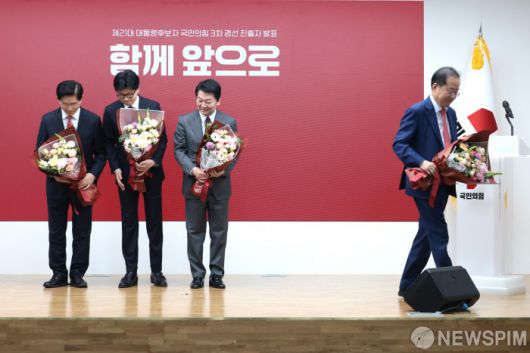 [서울=뉴스핌] 윤창빈 기자 = 국민의힘 홍준표 대선 경선 후보가 29일 오후 서울 여의도 중앙당사에서 열린 제21대 대통령후보자 선출을 위한 3차 경선 진출자 발표에서 결과 발표 후 기념촬영을 마치고 무대를 내려가고 있다. 2025.04.29 pangbin@newspim.com |
