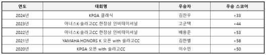 - 한편 ‘KPGA 클래식’에는 김찬우 외 2022년 변형 스테이블포드 방식 대회인 ‘아너스K·솔라고CC 한장상 인비테이셔널’에서 우승한 배용준(25.CJ)도 참가자 명단에 이름을 올렸다. 2020년 ‘KPGA 오픈 with 솔라고CC’ 우승자인 이수민(32.우리금융그룹)과 2021년 ‘YAMAHA·HONORS K 오픈 with 솔라고CC’ 챔피언 김한별, 2023년 ‘아너스K·솔라고CC 한장상 인비테이셔널’에서 우승한 고군택(26.대보건설)은 불참한다.