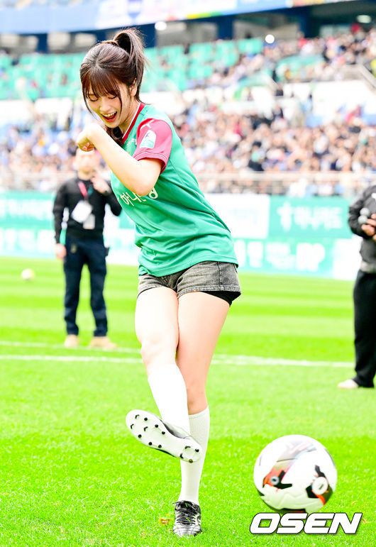 고향이 대전인 안유진은 짧은 반바지에 대전하나시티즌 유니폼을 입고 높게 묶은 포니테일 헤어스타일로 발랄한 스포티걸의 모습을 보여줬다. 특히 그는 디딤발을 딛고 정확한 시축 자세로 축구 팬들을 열광하게 만들었다. 또한 관중석을 향해 환하게 인사하며 '대전의 딸'로서 환호를 자아냈다고.