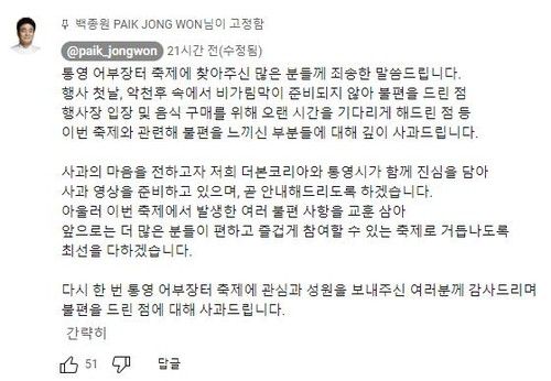 백종원 대표는 지난해 제1회 통영어부장터 행사 이후 축제를 찾아 준 많은 분에게 불편을 끼쳤다며 자신의 유튜브 채널에 올린 축제 홍보영상에 댓글을 다는 형태로 사과했다.