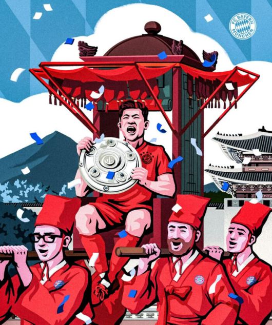 한국 팬들의 분노가 좀처럼 가라앉지 않자 뮌헨은 또다시 SNS에 한국의 고궁을 배경으로 김민재가 우승 트로피를 들고 꽃가마를 탄 이미지를 게재했습니다.