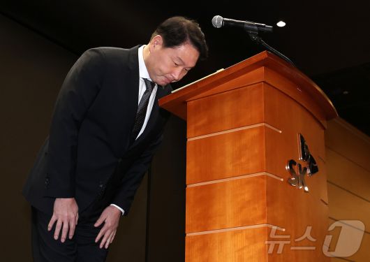 최태원 SK그룹 회장이 7일 오전 서울 중구 SK텔레콤 T타워 SUPEX홀에서 SK텔레콤의 해킹 사고와 관련해 대국민 사과를 하고 있다. (공동취재) 2025.5.7/뉴스1 ⓒ News1 박지혜 기자 |