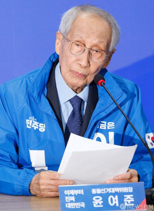 [서울=뉴스핌] 윤창빈 기자 = 윤여준 더불어민주당 총괄선거대책위원장이 7일 오전 서울 여의도 더불어민주당 중앙당사에서 열린 중앙선거대책위원회의에서 모두발언을 하고 있다. 2025.05.07 pangbin@newspim.com