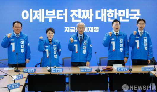 [서울=뉴스핌] 윤창빈 기자 = 김부겸(왼쪽부터)·강금실·윤여준·박찬대·김경수 더불어민주당 총괄선거대책위원장이 7일 오전 서울 여의도 더불어민주당 중앙당사에서 열린 중앙선거대책위원회의에서 구호를 외치고 있다. 2025.05.07 pangbin@newspim.com