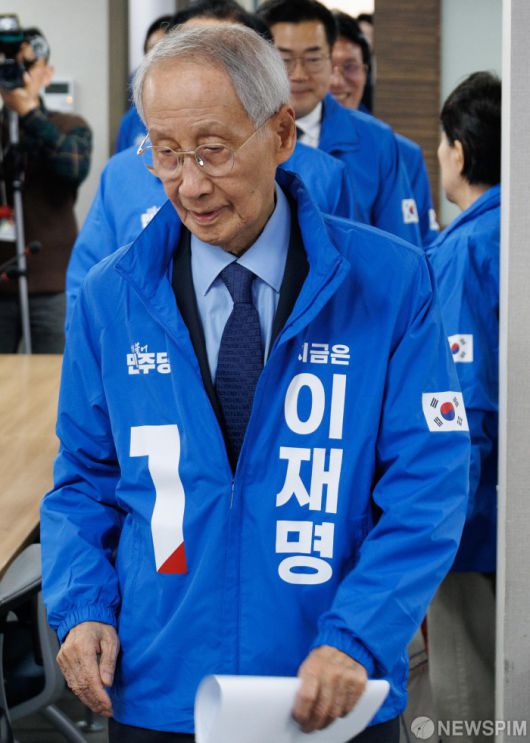 [서울=뉴스핌] 윤창빈 기자 = 윤여준 더불어민주당 총괄선거대책위원장이 7일 오전 서울 여의도 더불어민주당 중앙당사에서 열린 중앙선거대책위원회의에 참석하고 있다. 2025.05.07 pangbin@newspim.com