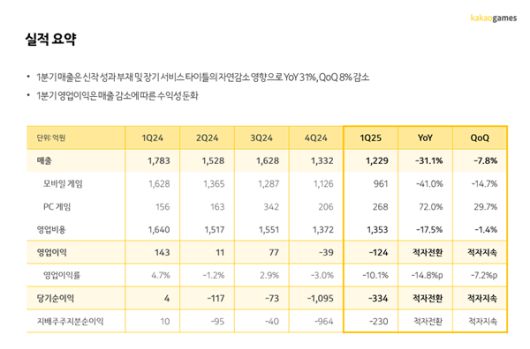 카카오게임즈는 2025년 1분기 매출은 전년 동기 대비 31.1% 감소한 1229억 원을 기록했다. 영업손실은 124억 원이 발생해 적자 전환됐다. 신작 부재 및 라이브 게임 자연 감소 영향이다.