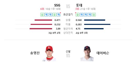 [스타데일리뉴스=정상훈기자] SSG 랜더스가 7일 오후 6시 30분 부산 사직야구장에서 롯데 자이언츠와 맞대결을 펼친다. 이날 SSG는 선발 투수로 송영진을 예고했다. 송영진은 시즌 2승 2패, 평균자책점 4.85, WHIP 1.54를 기록 중이며, 직구(143km/h)를 중심으로 커브(116km/h)와 슬라이더(134km/h)를 섞어 던진다. 롯데전에서는 1승 무패, 평균자책점 1.42로 강한 면모를 보여 왔다.
