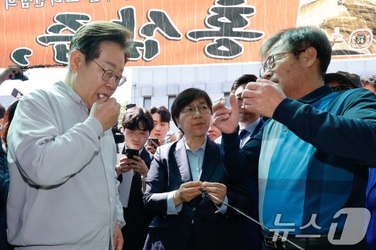 (진안=뉴스1) 안은나 기자 = 이재명 더불어민주당 대통령 후보가 2차 골목골목 경청투어 마지막 날인 7일 오전 전북 진안군 진무로의 인삼사를 찾아 수삼을 맛보고 있다. 2025.5.7/뉴스1coinlocker@news1.krCopyright ⓒ 뉴스1. All rights reserved. 무단 전재 및 재배포, AI학습 이용 금지.