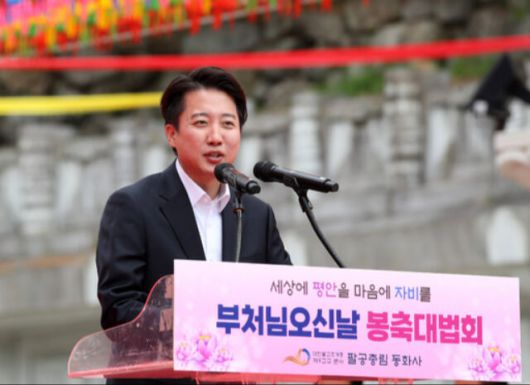 개혁신당 이준석 대선후보가 지난 5일 대구 동구 동화사 통일대불광장에서 열린 봉축대법회에 참석해 인사말을 하고 있다. 뉴스1 |
