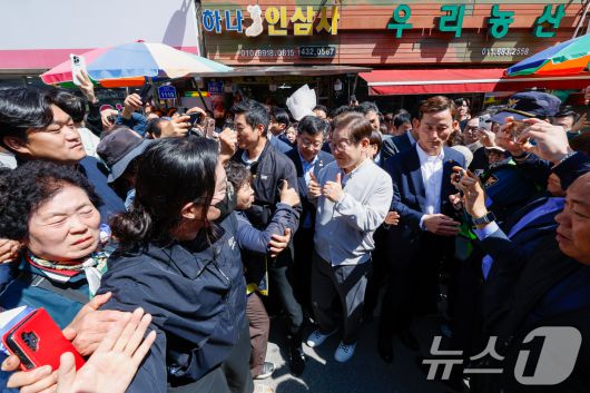(진안=뉴스1) 안은나 기자 = 이재명 더불어민주당 대통령 후보가 2차 골목골목 경청투어 마지막 날인 7일 오전 전북 진안군 진무로를 찾아 인사하고 있다. 2025.5.7/뉴스1coinlocker@news1.krCopyright ⓒ 뉴스1. All rights reserved. 무단 전재 및 재배포, AI학습 이용 금지.