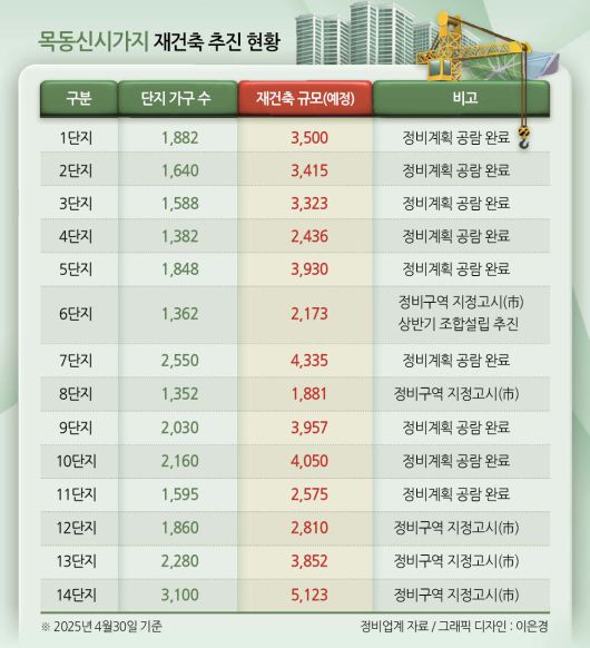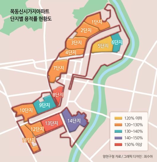 재건축 후 약 5만가구의 ‘미니 신도시’급으로 탈바꿈 예정인 목동신시가지 1~14단지 아파트는 1985년부터 1988년 사이 지어진 총 392개 동, 2만6629가구로 이뤄져 있다. 행정구역상 목동에 속하는 1~7단지는 ‘앞단지’, 신정동에 속하는 8~14단지는 ‘뒷단지’로 불린다. 이 중 구청과 오랜 갈등을 겪던 1~3단지가 지난해 11월 개방형 공공녹지(그린웨이)를 제공하는 조건으로 ‘종 상향(2→3종)’ 문제를 해결하면서 목동 일대 재건축이 급물살을 타게 됐다.
