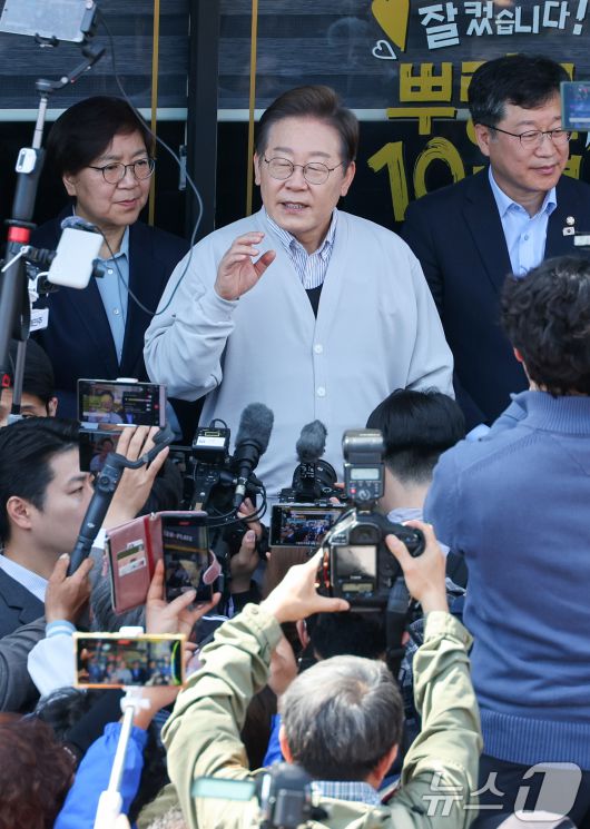(진안=뉴스1) 안은나 기자 = 이재명 더불어민주당 대통령 후보가 2차 골목골목 경청투어 마지막 날인 7일 오전 전북 진안군 진무로를 찾아 즉흥 연설하고 있다. 왼쪽부터 정은경 총괄선대위원장, 이 후보, 안호영 의원. 2025.5.7/뉴스1coinlocker@news1.krCopyright ⓒ 뉴스1. All rights reserved. 무단 전재 및 재배포, AI학습 이용 금지.
