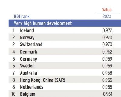 인간개발지수'(HDI) 상위 10개국 명단. 유엔개발계획(UNDP) '2025 인간개발 보고서' |