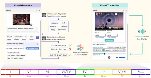 이성주 교수 연구팀이 개발한 어뮤즈(Amuse) 시스템은 텍스트, 이미지, 오디오와 같은 다양한 형식의 영감을 입력하면 이를 화성 구조(코드 진행)로 변환해 작곡을 지원해 주는 AI 기반 시스템이다. 사용자가 ‘따뜻한 여름 해변의 기억’과 같은 문구나 이미지, 사운드 클립을 입력하면, 어뮤즈는 해당 영감에 어울리는 코드 진행을 자동으로 생성해 제안한다. 기존의 생성 AI와 달리, 어뮤즈는 사용자의 창작 흐름을 존중하고, AI의 제안을 유연하게 통합·수정할 수 있는 상호작용 방식을 통해 창의적 탐색을 자연스럽게 유도한다는 점에서 차별성을 갖는다.
