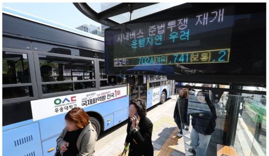 서울 시내버스 노조가 연휴가 끝난 뒤 첫차부터 준법투쟁(준법운행)을 재개한 7일 오전 서울 광화문의 한 버스정류장 전광판에 준법투쟁 재개로 인한 운행지연 안내문구가 표시되고 있다. 연합뉴스 |