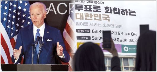 정치인을 대상으로 한 딥페이크 창작물이 빠르게 퍼져나가고 있다. 한국보다 앞서 치뤄진 미국 대선에서 한 정치 컨설턴트는 조 바이든 전 대통령의 목소리로 민주당 당원에게 투표 거부를 독려하는 가짜 전화 메시지를 만들어 벌금형을 받았다. 지난달 15일(현지시간) 미국 일리노이주 시카고 소피텔 호텔에서 열린 장애인 권익옹호자·상담사·대리인 콘퍼런스에서 연설하고 있는 조 바이든 전 미국 대통령(왼쪽)과 서울 종로구 서울시선거관리위원회 외벽에 걸린 이번 대선 투표일과 사전 투표일을 알리는 대형 현수막 [AFP·연합] |