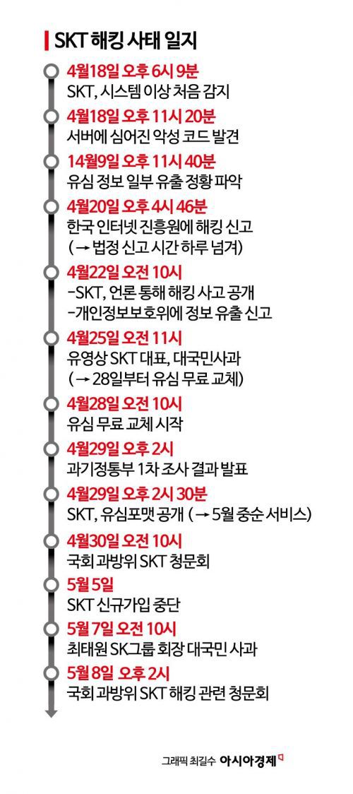 SKT는 유심 대란 발생 이후 5월 연휴 기간에도 매일 오전 10시 자체 브리핑을 열고 전 고객 유심 무료 교체, 교체용 유심 1000만개 확보, '유심보호서비스' 자동 가입과 해외 로밍 시 적용(14일부터) 등의 대책을 발표하며 수습에 총력을 기울여왔다. 6일 오후 6시 기준 자사 고객(SK텔레콤망 사용 알뜰폰 포함) 2411만명이 유심보호서비스에 가입했다고 7일 밝혔다. 해외 로밍 요금제 이용자를 제외한 가입 가능한 모든 고객이 가입한 것이라는 설명이다. 같은 날 기준 유심을 교체한 고객 수는 107만명이다.