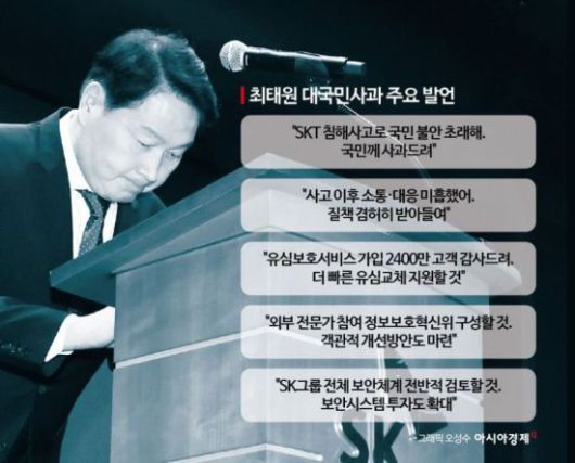 최 회장이 19일 만에 직접 대국민 사과에 나선 건 이번 해킹 사태가 전 국민적인 사태로 불거진 데다 SKT가 초유의 위기를 겪고 있기 때문이다. SK그룹 관계자는 "그룹차원에서 책임감을 가지고 대응하겠다는 의지를 드러낸 것"이라며 "회장이 직접 나서 사태 수습을 국민에게 약속한 것"이라고 설명했다.