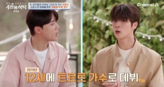 정동원은 5일 방송된 채널A ‘절친 토큐멘터리 4인용식탁’(이하 ‘4인용식탁’)에 출연했다. 이번 방송은 가수 겸 뮤지컬 배우 김준수 편으로 꾸며졌으며, 정동원은 그가 초대한 절친한 동료 중 한 명으로 뮤지컬 배우 손준호·SS501 김형준과 함께 4인용 식탁에 자리했다.