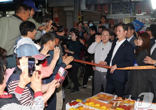 (임실=뉴스1) 안은나 기자 = 이재명 더불어민주당 대통령 후보가 2차 골목골목 경청투어 마지막 날인 7일 오전 전북 임실군 임실시장을 찾아 인사하고 있다. (공동취재) 2025.5.7/뉴스1