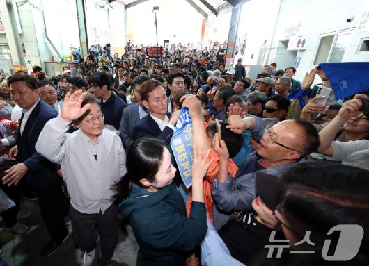 (임실=뉴스1) 안은나 기자 = 이재명 더불어민주당 대통령 후보가 2차 골목골목 경청투어 마지막 날인 7일 오전 전북 임실군 임실시장을 찾아 인사하고 있다. (공동취재) 2025.5.7/뉴스1