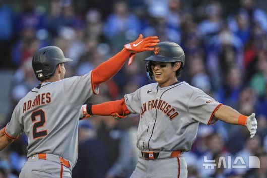 [시카고=AP/뉴시스] 샌프란시스코 자이언츠의 이정후(오른쪽)가 6일(현지 시간) 미 일리노이주 시카고의 리글리 필드에서 열린 2025 메이저리그 시카고 컵스와의 경기 3회 초 2점 홈런을 친 후 홈에 들어와 윌리 아다메스와 환호하고 있다. 2025.05.07. |