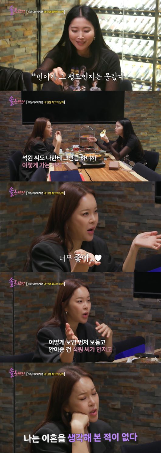 또한 "어딘가에 나가서 '나는 이혼을 생각해본 적이 없다'고 자주 얘기했다. 이 사람과의 이혼은 내 사전엔 없다는 마음으로 살고 있다. 그리고 이 사람은 나 없으면 안 된다. 그래서 이혼하면 안 된다"고 덧붙였다.