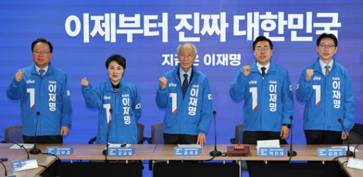 (왼쪽부터)김부겸, 강금실 총괄선대위원장, 윤여준, 박찬대 상임 총괄선대위원장, 김경수 총괄선대위원장이 7일 오전 서울 여의도 중앙당사에서 열린 중앙선거대책위원회의 시작에 앞서 구호를 외치고 있다. 연합뉴스 |