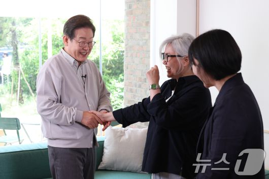 (전주=뉴스1) 안은나 기자 = 이재명 더불어민주당 대통령 후보가 2차 골목골목 경청투어 마지막 날인 7일 오후 전북 전주시의 카페에서 열린 '영화와 드라마, 정치가 그리는 미래의 스크린' K-콘텐츠 산업 진흥 간담회에서 김은숙 작가와 악수하고 있다. 2025.5.7/뉴스1