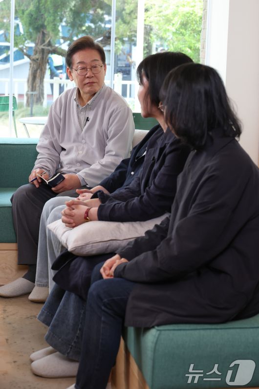 (전주=뉴스1) 안은나 기자 = 이재명 더불어민주당 대통령 후보가 2차 골목골목 경청투어 마지막 날인 7일 오후 전북 전주시의 카페에서 '영화와 드라마, 정치가 그리는 미래의 스크린' K-콘텐츠 산업 진흥 간담회를 하고 있다. 2025.5.7/뉴스1