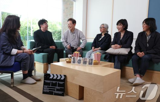 (전주=뉴스1) 안은나 기자 = 이재명 더불어민주당 대통령 후보가 2차 골목골목 경청투어 마지막 날인 7일 오후 전북 전주시의 카페에서 '영화와 드라마, 정치가 그리는 미래의 스크린' K-콘텐츠 산업 진흥 간담회를 하고 있다. 왼쪽부터 강유정 의원, 윤제균 감독, 이 후보, 김은숙 작가, 박해영 작가, 정주리 감독. 2025.5.7/뉴스1