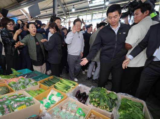 더불어민주당 이재명 대선 후보가 '골목골목 경청투어:국토종주편'에 나선 7일 전북 임실군 임실시장에서 시민 및 지지자들에게 인사를 하고 있다. 2025.5.7 |