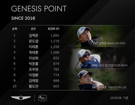 김백준의 뒤를 이어 ‘제44회 GS칼텍스 매경오픈’에서 정상에 오른 문도엽(34.DB손해보험)이 1,577.00포인트로 제네시스 포인트 2위, ‘2025 우리금융 챔피언십’에서 우승컵을 들어올린 이태훈(35.캐나다)이 1,259.33포인트로 제네시스 포인트 3위에 랭크됐다.