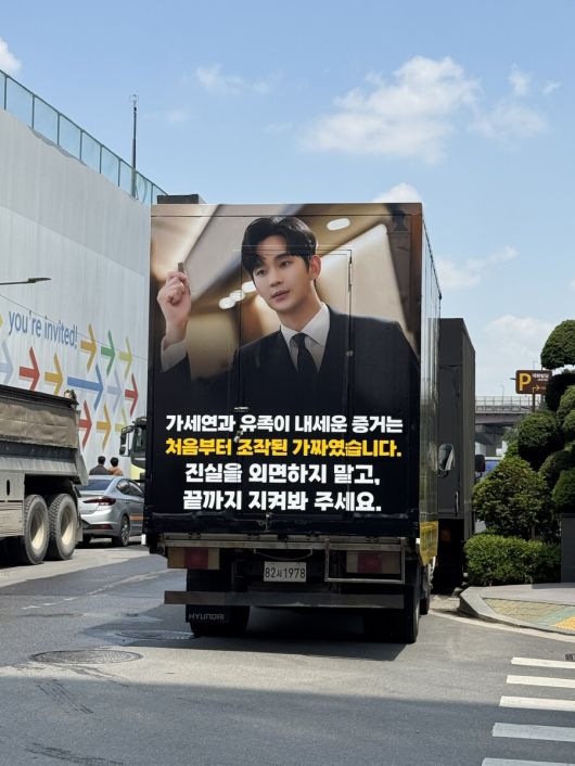 김수현의 팬들은 7일 김새론 유족이 기자회견 장소 근처에 트럭을 보내 "가세연과 유족이 내세운 증거는 처음부터 조작된 가짜였다"라며 "진실을 외면하지 말고 끝까지 지켜봐 달라"고 호소했다.