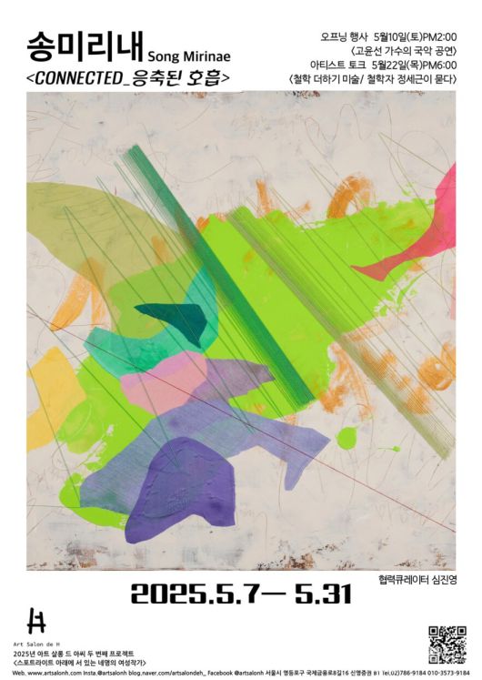 (문화뉴스 이미숙 기자) 오는 31일까지 송미리내 작가가 아트살롱 드 아씨에서 개인전 'CONNECTED_응집된 호흡'을 개최한다. 이번 전시는 VIP 오프닝이 오는 10일 오후 2시에 열리며, 22일 오후 6시 30분에는 철학자와 함께하는 특별 토크 프로그램이 진행될 예정이다.
