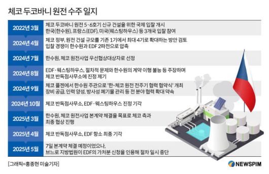 다만 7일로 예정됐던 본계약은 프랑스 전력공사(EDF)의 가처분 신청으로 인해 절차가 일시 중단된 상태다. 체코 정부는 법적 절차가 마무리될 때까지 계약을 보류한 상태로, 사실상 일정이 기약 없이 연기된 셈이다. 정부는 예상치 못한 위기를 딛고 최대한 신속히 계약을 마무리할 수 있도록 총력을 다하겠다는 방침이다.