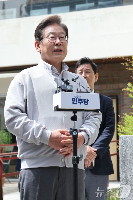 (전주=뉴스1) 안은나 기자 = 이재명 더불어민주당 대통령 후보가 2차 골목골목 경청투어 마지막 날인 7일 오후 전북 전주시의 카페 앞에서 공직선거법 위반 사건 파기환송심 첫 공판기일 연기에 대해 "법원의 합당한 결정"이라는 입장을 밝히고 있다. 2025.5.7/뉴스1